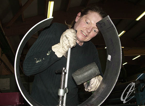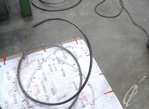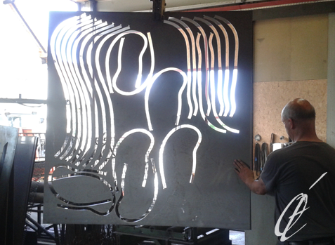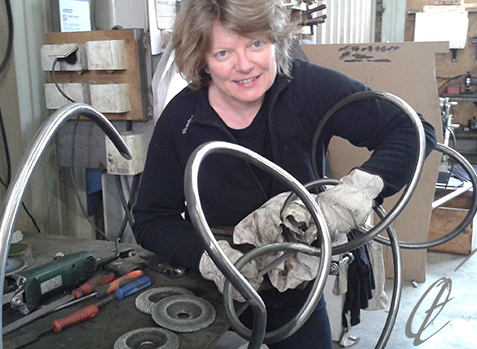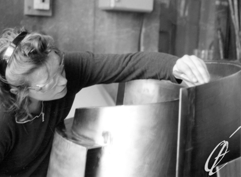 ‘’En dehors de l’atelier bois, j’ai été formée aux techniques de la céramique avec une préférence pour la plaque et le moulage. La réalisation de moules en plâtre a été une excellente introduction aux techniques d’étampage et de fonte du métal. Dans le cadre de mon métier de designer, une formation professionnelle en atelier de bijouterie m’a permise, par pure transposition d'échelle des matériaux et des outils, d’accéder directement à la réalisation de mes sculptures en atelier de métallerie. J'ai d'abord retrouvé un travail à la plaque en roulage, puis expérimenté le fil. Pour la mise en forme de mes ''Calligraphies 3D'', je cintre de longs tubes d'acier auxquels je donne du volume, avant de les souder.
